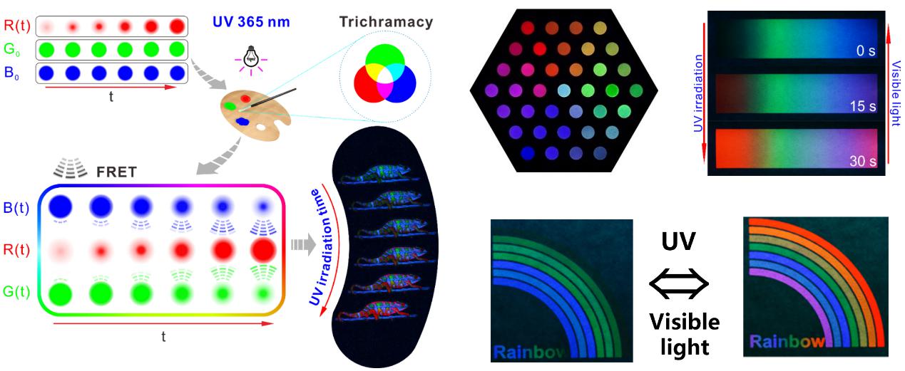 比如發(fā)光的防偽材料,利用纖維素均相可控反應(yīng)的優(yōu)勢,把原來容易聚在一起的熒光分子,通過化學方法鍵合到纖維素上,克服了溶液狀態(tài)下聚集誘導淬滅效應(yīng),將其制成固態(tài)熒光材料,同時它仍然具有高分子的可打印、可噴涂的特點,將不同的發(fā)光基團接到不同的纖維素上可以得到不同的顏色,將紅、綠和藍三種顏色的纖維素衍生物共混,利用三基色原理,還可以做打印的動態(tài)熒光材料(圖5)。