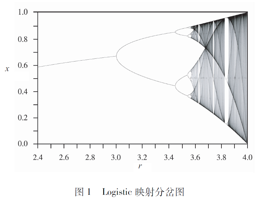 首先給大家介紹一下非線性動力學(xué)的基本概念??紤]到在座的大多是等離子體方面的專家,對非線性動力學(xué)不太熟悉,因此我就從最簡單的離散映射系統(tǒng)開始為大家進(jìn)行介紹。這個映射系統(tǒng)雖然看起來非常簡單,但足以讓大家比較好地理解非線性動力學(xué)的基本概念。Logistic映射數(shù)學(xué)表達(dá)式是xn+1=rxn(1-xn),它是非線性動力學(xué)里非?;A(chǔ)的一個例子。盡管Logistic映射看起來很簡單,但它已經(jīng)是一個動力學(xué)系統(tǒng),即它的狀態(tài)變量是隨時間演化的。對于我們現(xiàn)在討論的Logistic映射,比如說第n步是xn,那第n+1步是什么呢?很簡單,由映射關(guān)系就可以得到xn+1。我們來觀察它隨時間會如何演化,比如說從x0開始,迭代第一步得到x1,再得到x2,一直迭代下去我們最終可以觀察到映射的穩(wěn)態(tài)結(jié)果,那我們究竟可以觀察到什么樣的穩(wěn)態(tài)行為呢?這其實就是非線性動力學(xué)研究的一個主要內(nèi)容。我們來看這么一個簡單的Logistic映射,圖1給出了它的分岔圖。顯然,映射最終的穩(wěn)態(tài)行為是與映射的參數(shù)有關(guān)系的,通過圖1的分岔圖我們就可以觀察映射在各個參數(shù)下的穩(wěn)態(tài)行為。
