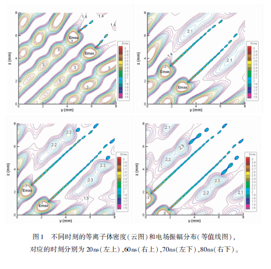 下面看一下相交微波束大氣擊穿的模擬結(jié)果,我們首先算了同頻率微波相交的情況,此時相干疊加之后,由于干涉作用,會形成電場強(qiáng)度強(qiáng)弱分布。我們首先模擬一下種子電子在弱場區(qū)的情況。因為在大氣中種子電子是偶然出現(xiàn)的,有可能出現(xiàn)弱場區(qū),如果出現(xiàn)在弱場區(qū),它需要擴(kuò)散,擴(kuò)散到強(qiáng)場區(qū)之后電子碰撞分子發(fā)生雪崩電離,形成的等離子體沿著強(qiáng)場區(qū)做趨源運(yùn)動,運(yùn)動方向沿著)=:的這條線。形成的等離子體的區(qū)域是一個等離子體絲帶,當(dāng)然如果把氣壓降低,會發(fā)現(xiàn)絲帶就會過渡為一個等離子體帶。圖1給了幾個典型時刻的等離子體密度分布和場強(qiáng)的分布,在20ns的時候,由于靠近等離子體區(qū)域最強(qiáng)的場是沿著)=:這條線的,當(dāng)?shù)入x子體絲帶長度增加到一定程度的時候,在其左上和右下區(qū)域,相當(dāng)于把兩個微波場隔開,這兩個區(qū)域相當(dāng)于只有一個單微波的作用,在兩邊有新的等離子體絲帶。如果初始電子出現(xiàn)在強(qiáng)場區(qū),電子碰撞分子就會雪崩電離,形成等離子體。等離子體區(qū)域也是沿著J=:這條線做趨源運(yùn)動。下面簡單比較了同頻和非同頻微波相交的大氣擊穿,同頻相當(dāng)于相干疊加,非同頻相當(dāng)于非相干疊加,模擬時間都是80ns,初始的種子電子數(shù)都一樣,可以發(fā)現(xiàn)在相干的情況下,即使把種子電子源放到場強(qiáng)最小的地方,產(chǎn)生等離子體的區(qū)域也大于非相干的情況,而且產(chǎn)生的最大電子數(shù)也是大于非相干的情況??偨Y(jié)主要有三點(diǎn),一個是區(qū)域隨壓強(qiáng)的變化,還有等離子體做趨源運(yùn)動,還有相干比非相干的等離子體區(qū)域比較大。