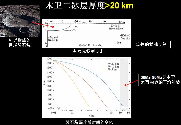 冰層厚度很重要:厚的冰層可能發(fā)生對(duì)流,有利于表面與水的連通;過薄的冰層不利于對(duì)流的發(fā)生,限制了表面與水的連通。動(dòng)力學(xué)數(shù)值模擬揭示:木衛(wèi)二冰層厚度大于20km。