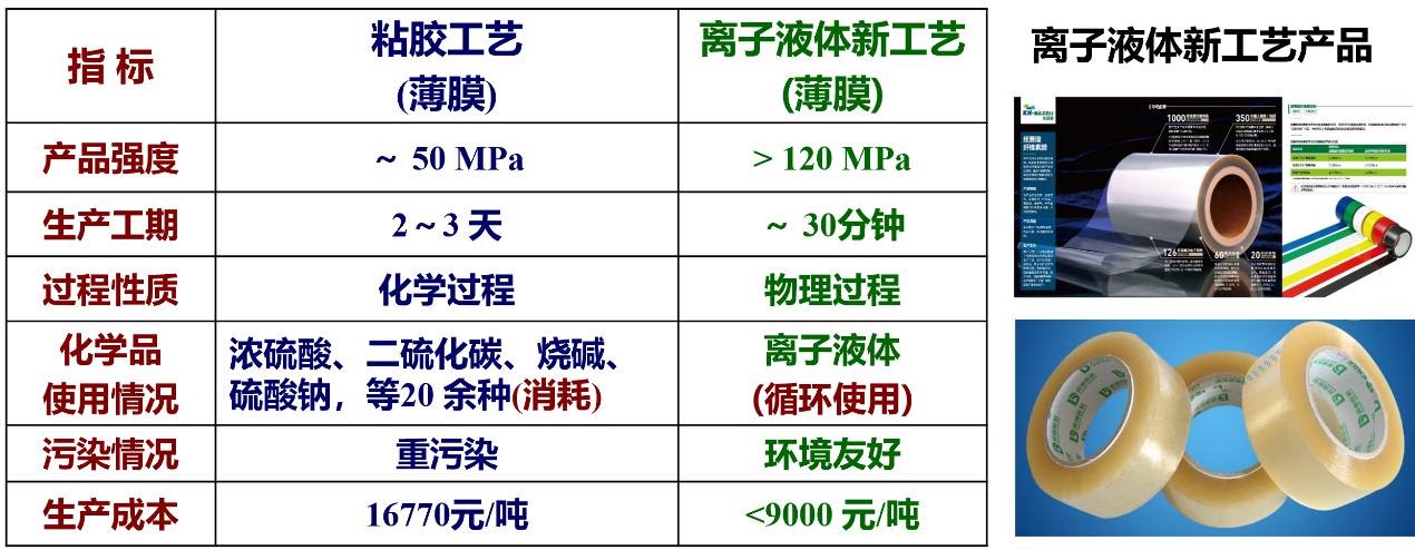 以前纖維素制膜工藝污染很大,中國逐漸在關停。而我們的離子液體工藝是物理溶解,基本沒有污染。原來工藝需要三天時間,現在三十分鐘就做出來了(圖8)。在車間里面都聞不到氣味,火都點不著,非常安全。其中溶劑是我們的專利,包括后面的溶劑回收,溶劑是可以回收再反復利用的。用我們這個工藝與企業(yè)合作建立了生產線,2019年基本已經建成了,今年11月底試車。生產的產品推薦在快遞物流上使用,特別是用低成本秸稈做的膠帶,有很好的應用前景。